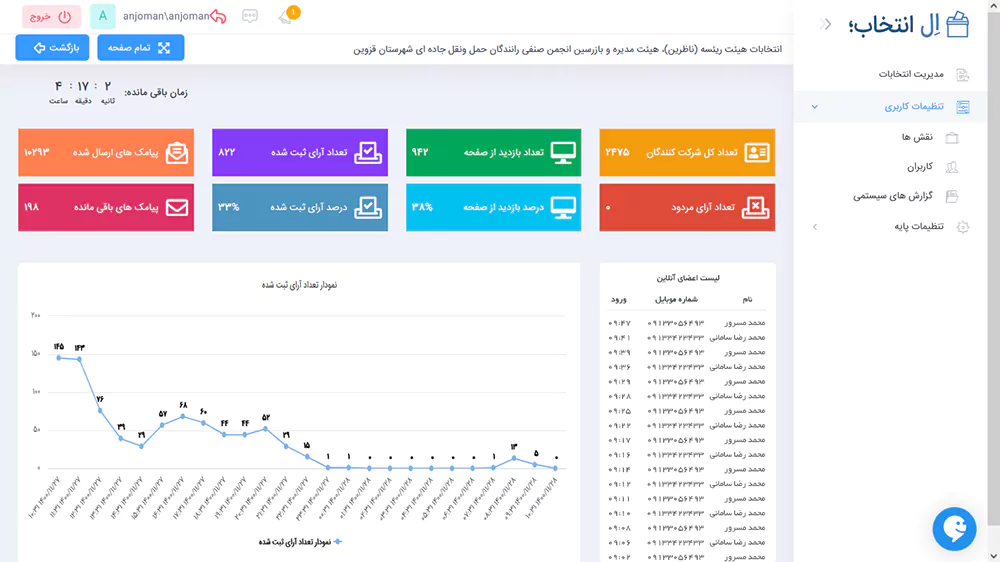 اطلاعاتی اعم از تعداد کل شرکت کنندگان، تعداد آرای مردود، تعداد و درصد افراد حاضر در جلسه ، تعداد و درصد آرای ثبت شده، پیامک های ارسال شده، پیامک های باقی مانده و یک نمودار لحظه ای که نشان می دهد در هر ساعت چه تعداد رای ثبت شده است. را مشاهده می کنید.