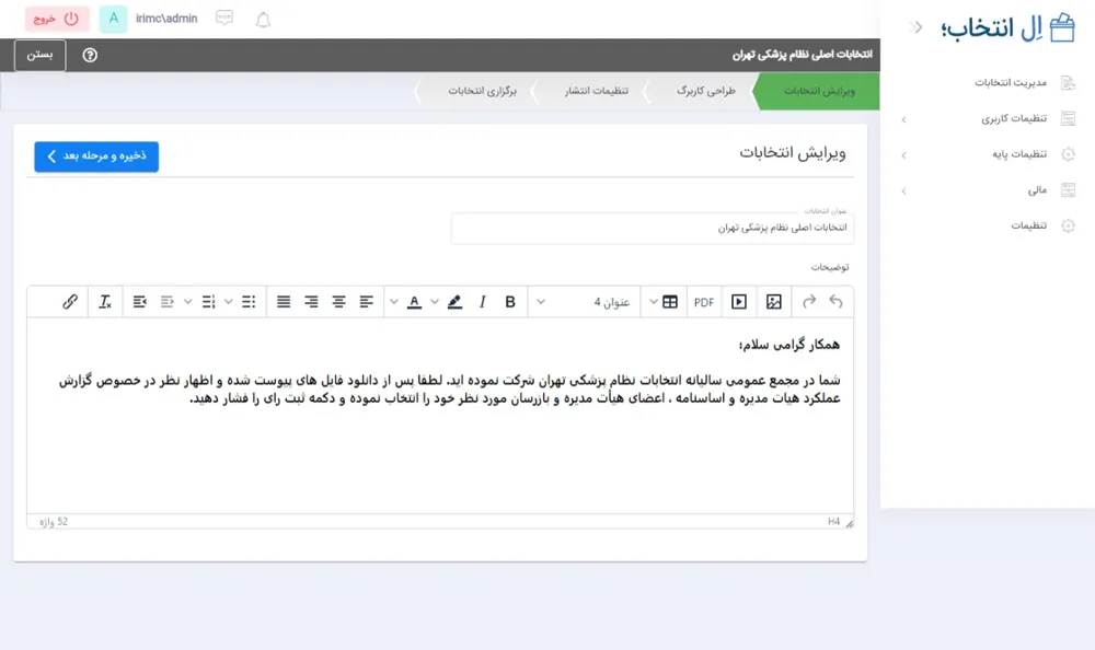 ابتدا باید عنوان رسمی مجمع و انتخابات خود را تعیین نمایید، برای مثال: "برگزاری انتخابات هیئت رئیسه مجمع عمومی نظام پزشکی استان تهران" در بخش توضیحات نیز نکات و راهنمایی های لازم برای شرکت کنندگان را شرح دهید. سپس بر روی دکمه ذخیره و مرحله بعد کلیک کنید تا وارد گام دوم یعنی طراحی کاربرگ انتخاباتی شوید.