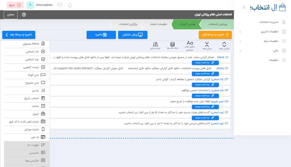 برای این کار منوی عمودی سمت چپ صفحه انواع مختلف فیلد ها را در اختیارتان قرار می دهد. این عناصر عبارتند از: محتوای HTML، پرسش تک انتخابی، چند انتخابی، لیست کشویی، متن کوتاه، متن مشروع، عددی، تاریخ، ایمیل، ساعت، تلفن ثابت، موبایل و کد ملی.