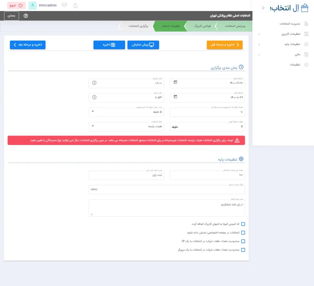 در این مرحله ابتدا شما باید تنظیمات مربوط به زمان بندی، کد احرازهویت، مهلت پاسخ گویی و نوع انتخابات را تعیین کنید.