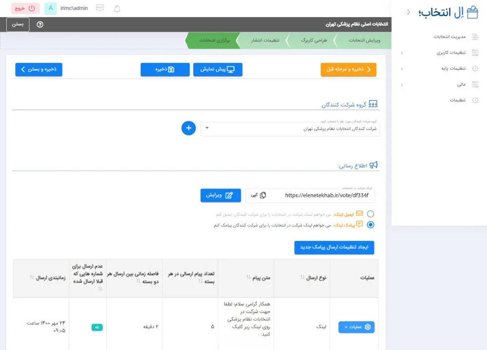 پیشنهاد می شود در تظیمات ایمیل و پیامک یک یادآوری برای چند روز قبل انتخابات و یک ارسال لینک برای روز برگزاری انتخابات تنظیم کنید.