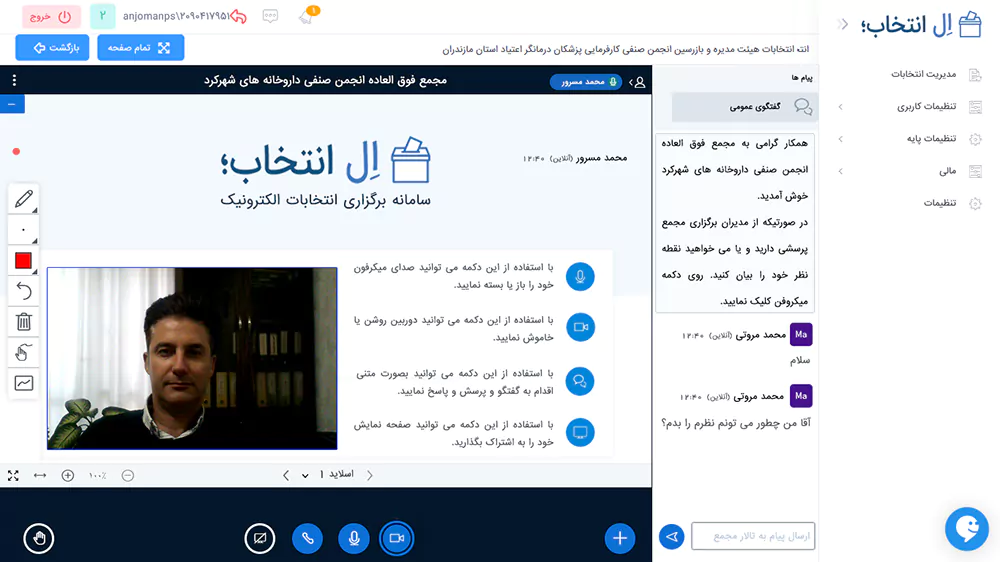 شما می توانید جلسه آنلاین به صورت صوتی/تصویری و یا فقط صوتی با شرکت کنندگان انتخابات داشته باشید، و به سوالات شرکت کنندگان پاسخ دهید و همچنین در صورت لزوم گزارش عملکرد و متن اساسنامه انتخابات را برای شرکت کنندگان قرائت کنید.