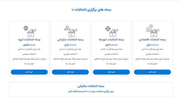 در صورتی که انتخابات شما برای بیش از 2000 نفر می باشد، می توانید گزینه "بسته انتخابات سفارشی" را انتخاب کنید و بعد از آن تعداد شرکت کنندگان و تعداد انتخابات را وارد کنید و بر روی دکمه "محاسبه مبلغ" کلیک کنید.