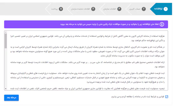 سپس با انتخاب گزینه "قوانین و شرایط ثبت نام در سامانه را مطالعه کردم و می پذیرم" در پایین متن توافقنامه می توانید به مرحله بعدی بروید.