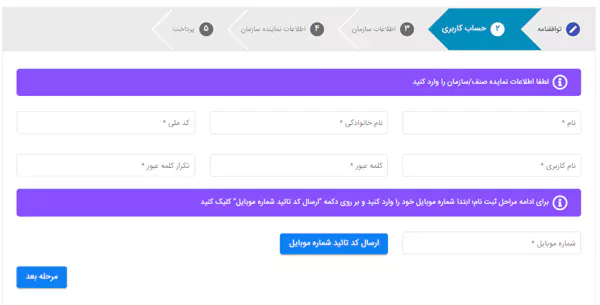 اطلاعات نماینده صنف و یا سازمان را وارد نماید، این اطلاعات شامل نام، نام خانوادگی، شماره موبایل، کلمه عبور و تکرار آن می باشد.