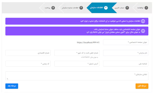 در این مرحله لازم است اطلاعات سازمان یا صنفی را که قصد برگزاری مجمع و انتخابات آن را دارید ثبت نمایید.