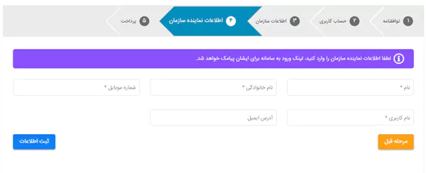 لازم به ذکر است از صحت شماره موبایل نماینده سازمان اطمینان حاصل کنید چون لینک ورود به سامانه که حاوی اطلاعات امنیتی است برای این شماره پیامک خواهد شد.