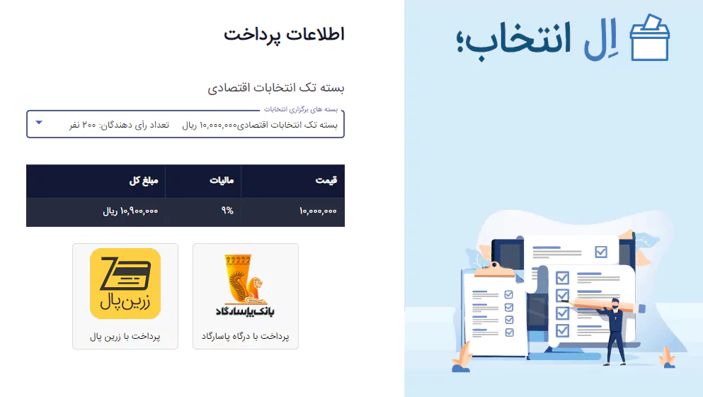 بعد از انتخاب یکی از درگاه های پرداخت شما به صفحه بانک هدایت خواهید شد. پس از پرداخت بسته انتخاباتی حساب کاربری شما فعال خواهد شد.