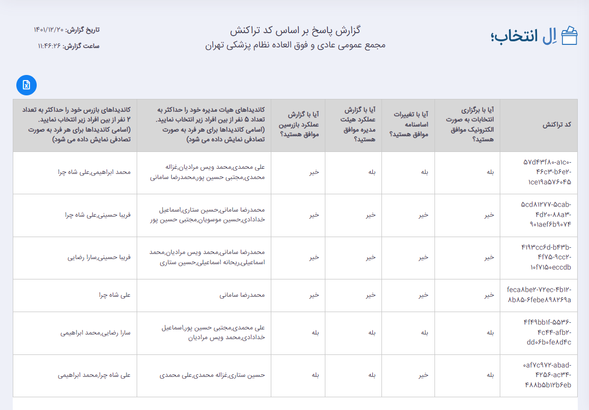 در گزارش پاسخ بر اساس کد تراکنش، کسانی که در انتخابات شرکت کرده اند و گزینه هایی که انتخاب کرده اند را مشاهده خواهید کرد.
