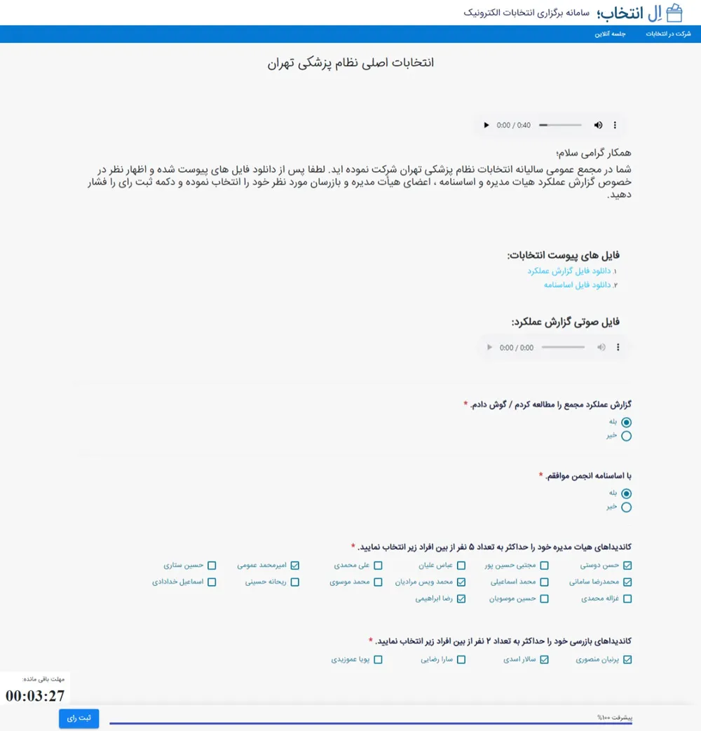 این صفحه، صفحه شرکت در انتخابات می باشد؛ در این صفحه شرکت کننده باید ابتدا فایل های مربوط به گزارش عملکرد و اساسنامه را دانلود کند و یا به فایل صوتی گزارش عملکرد گوش کند سپس، سوال های مربوط به آن ها را تایید کند.